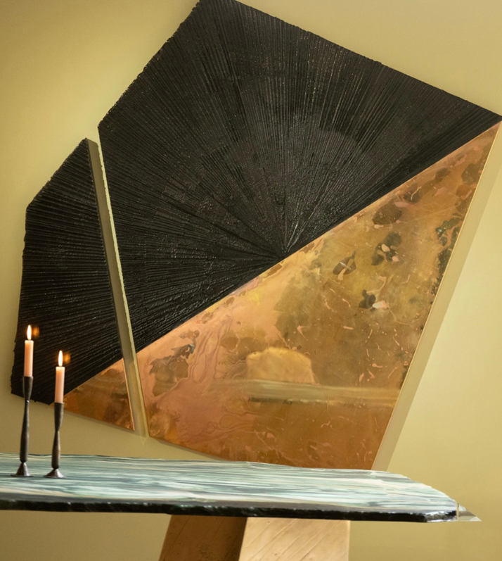 The influence of Italy’s industrial landscape, with its clean lines and functional forms, is evident in Alex’s approach, where simplicity meets sophistication in a harmonious balance and natural elements unite with synthetic substance like the epoxy resin. Intertwined with the Arte Povera inheritance, a minimalist art movement that thrived in industrial Italy, this influence shapes his work’s geometric rigor and disciplined structure. The boundary between art and design becomes fluid and indistinguishable in Alex’s creations.