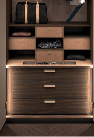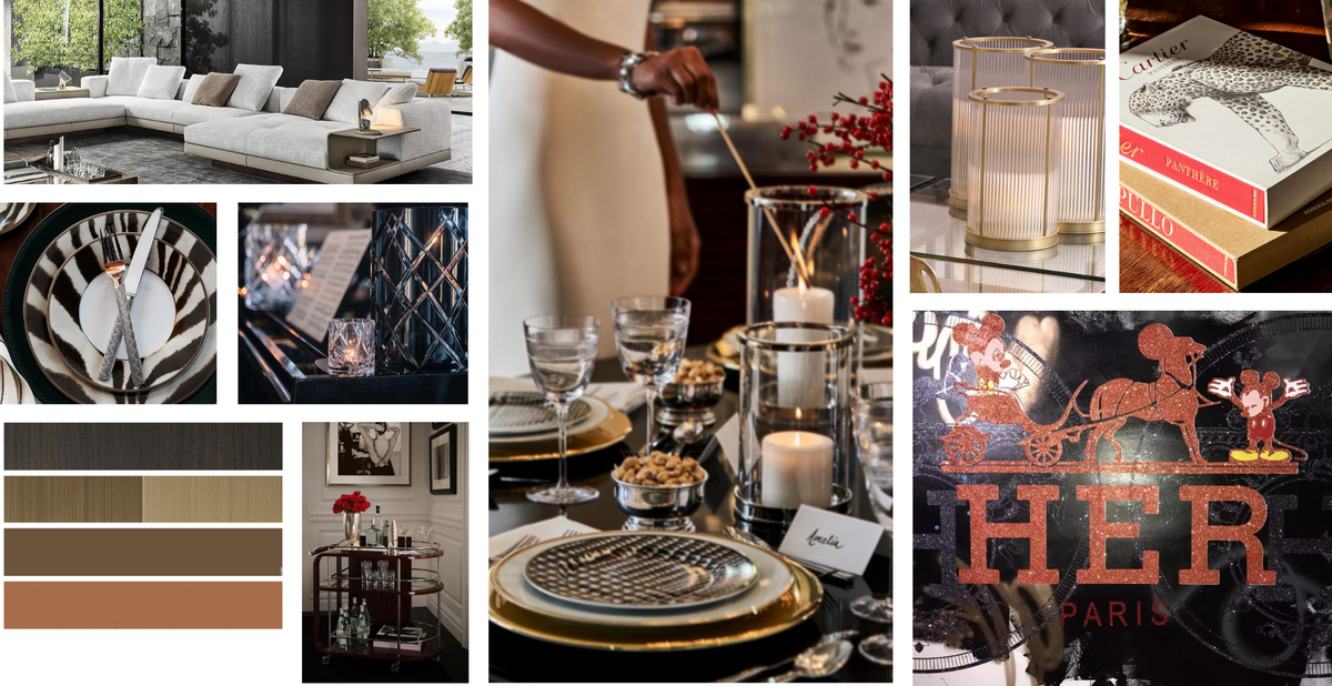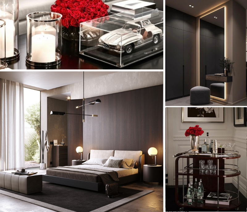 The color palette is dominated by shades of gray, black, and neutrals with gold and Hermes orange accents, the bespoke furniture is sleek and modern, with clean lines and sumptuous materials creating a sense of classic contemporary elegance.