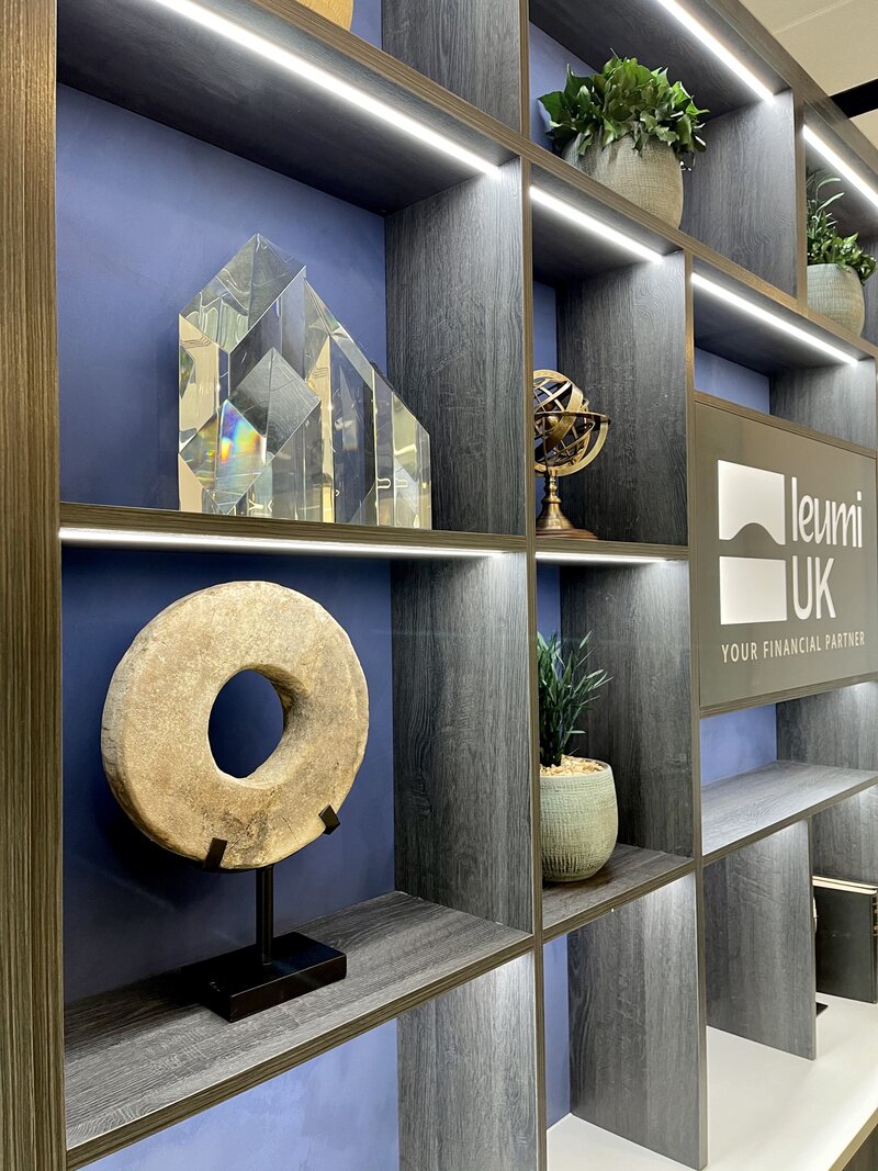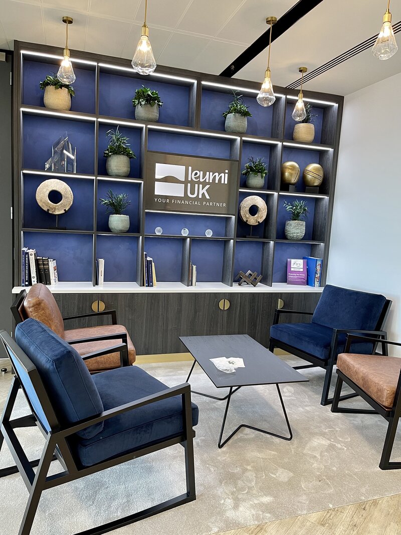 The Leumi Bank office in Angel court, was a beautiful blue and mahogany brown office which we fully remodelled with art and accessories.
